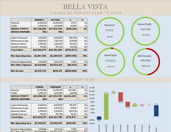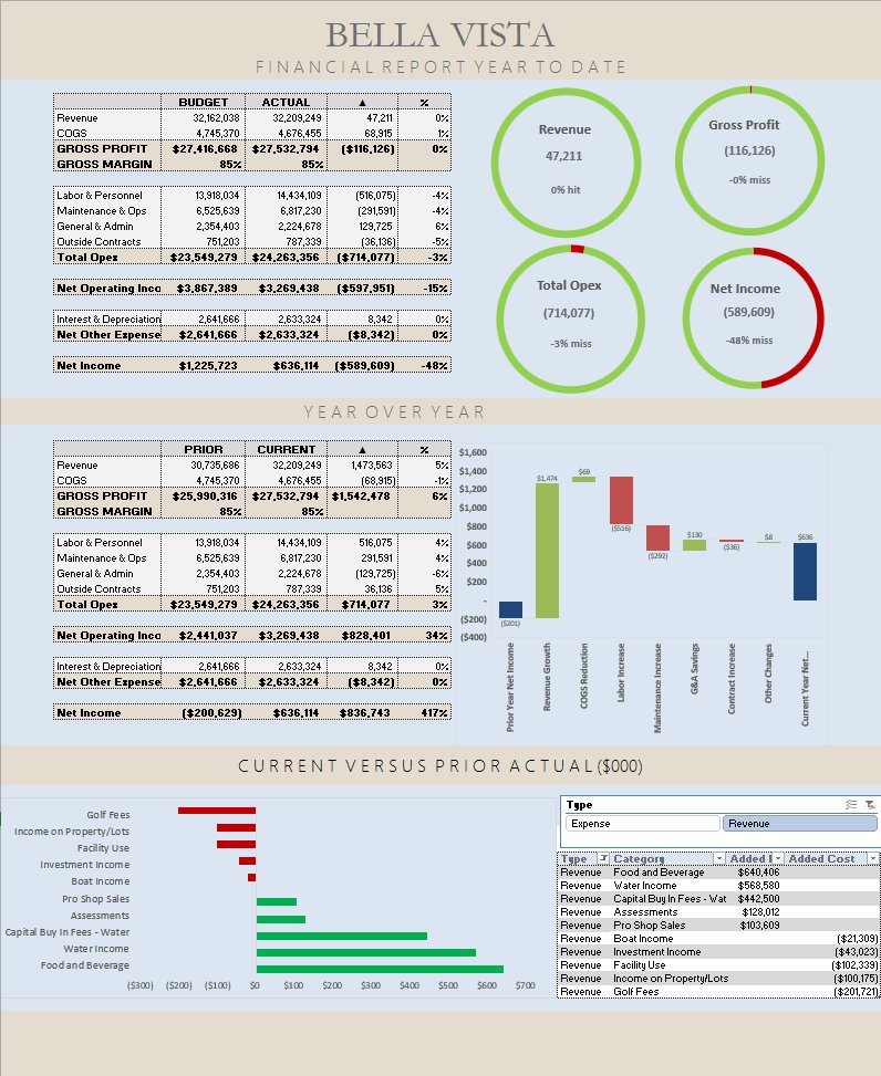 Interactive Excel dashboard analyzing budget vs. actual performance for Bella Vista Property Owners Association. Features YTD variance analysis, YoY comparisons, KPI tracking with visual indicators, and waterfall charts showing revenue/expense breakdown across 9 major categories.