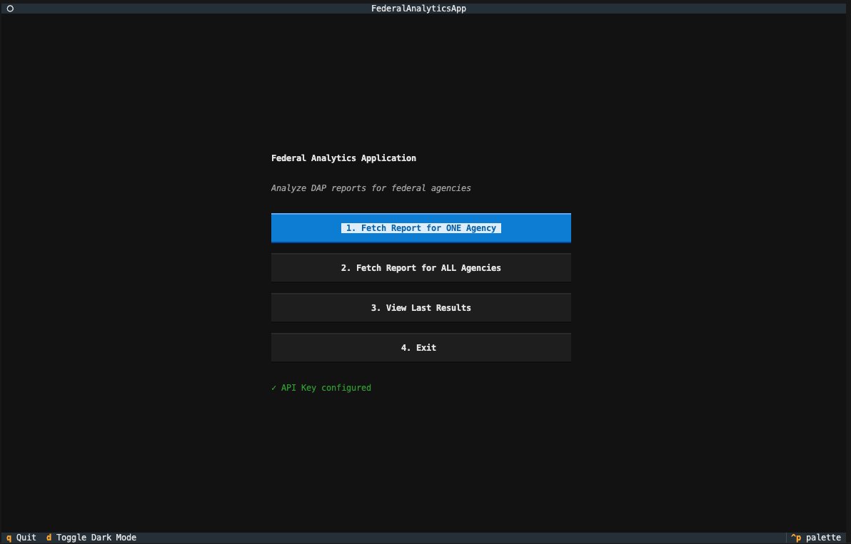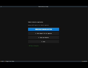 Terminal-based tool for analyzing DAP reports across federal agencies with API integration and data caching.
